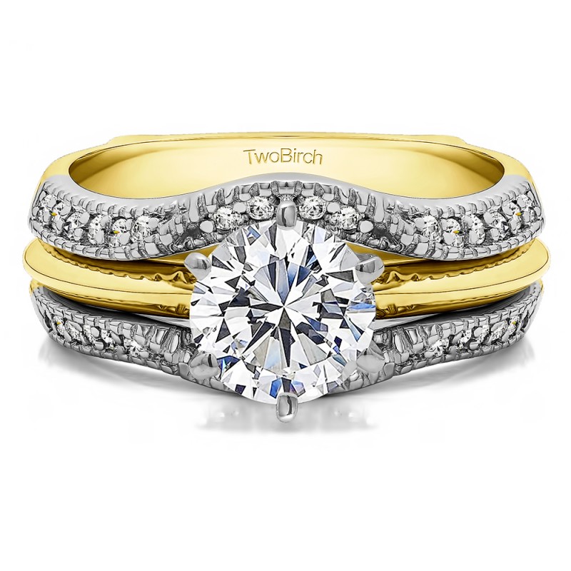 This wedding ring guard has 32 round, prong set stones. Each band measures 2.6 millimeters wide. This ring guard has 0.24 carats total weight. It is made to fit a round solitaire from 0.5 carats to 2, or a princess cut solitaire from 0.25 up to 2 carats.