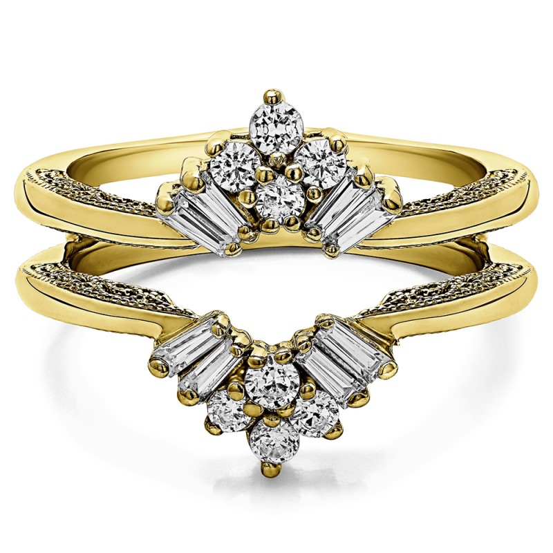 This wedding ring guard has 16 round, prong set stones. Each band measures 2.6 millimeters wide. This ring guard has 0.44 carats total weight. It is made to fit a round solitaire from 0.5 carats to 0 carats.