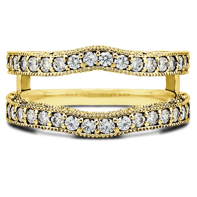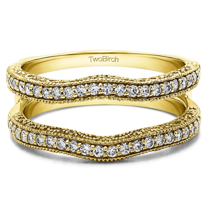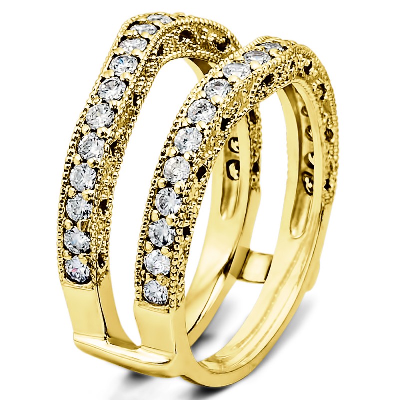 This wedding ring guard has 48 round, channel set stones. Each band measures 2 millimeters wide. This ring guard has 0.48 carats total weight. It is made to fit a round, princess, or marquise cut solitaire from 0.25 carats to 1 carats.