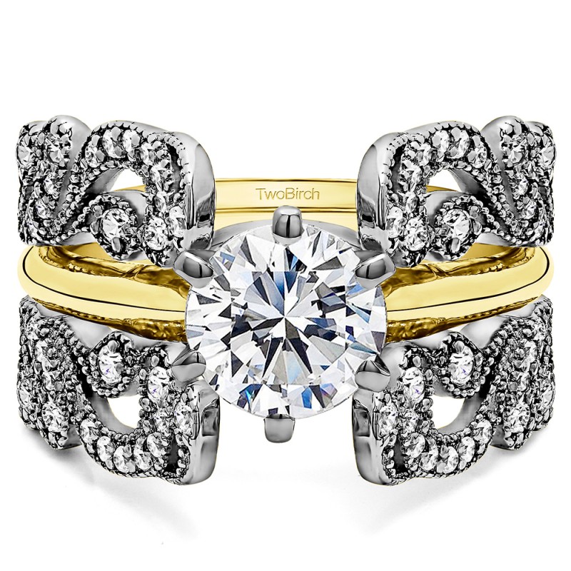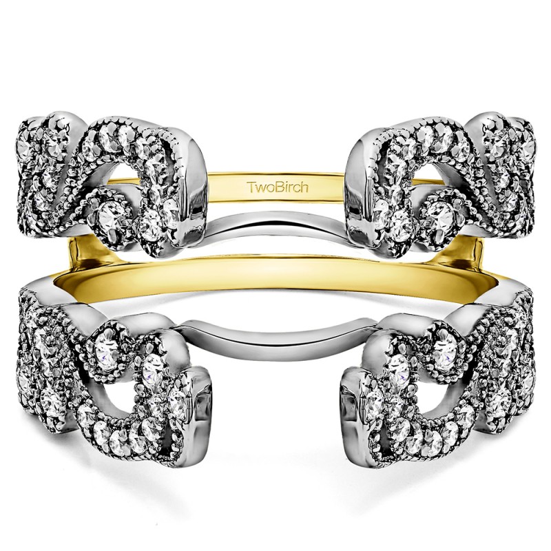 This wedding ring guard has 56 round, prong set stones. Each band measures 2 millimeters wide. This ring guard has 0.5 carats total weight.