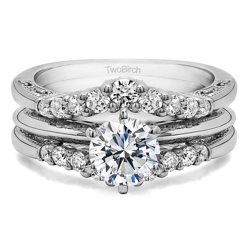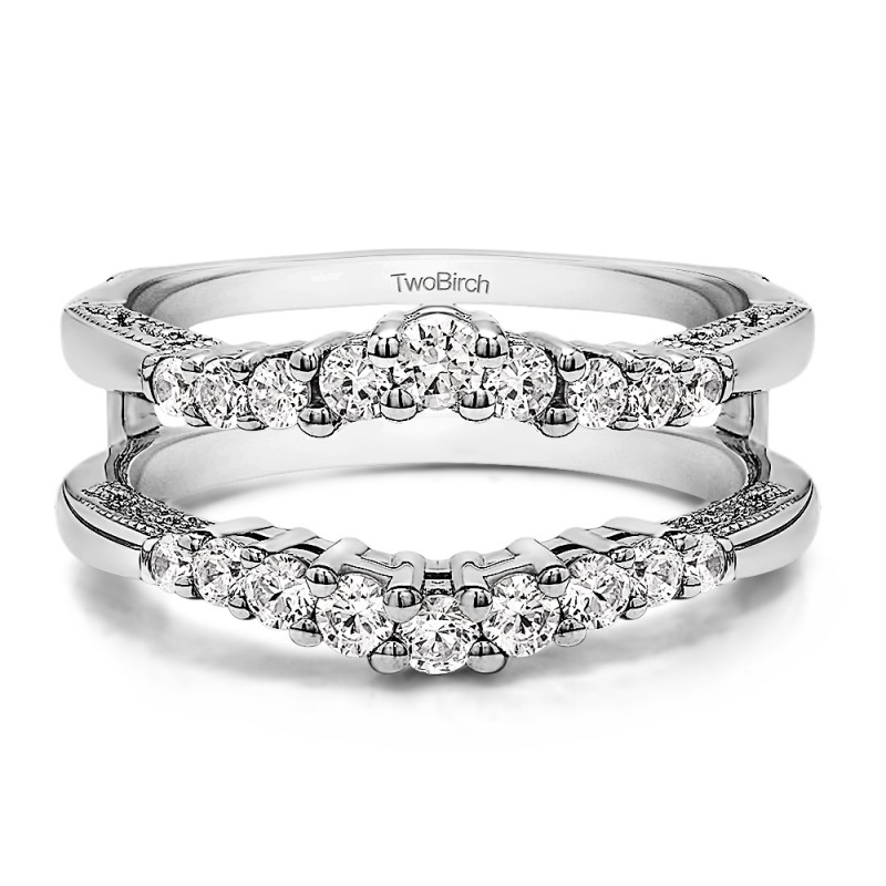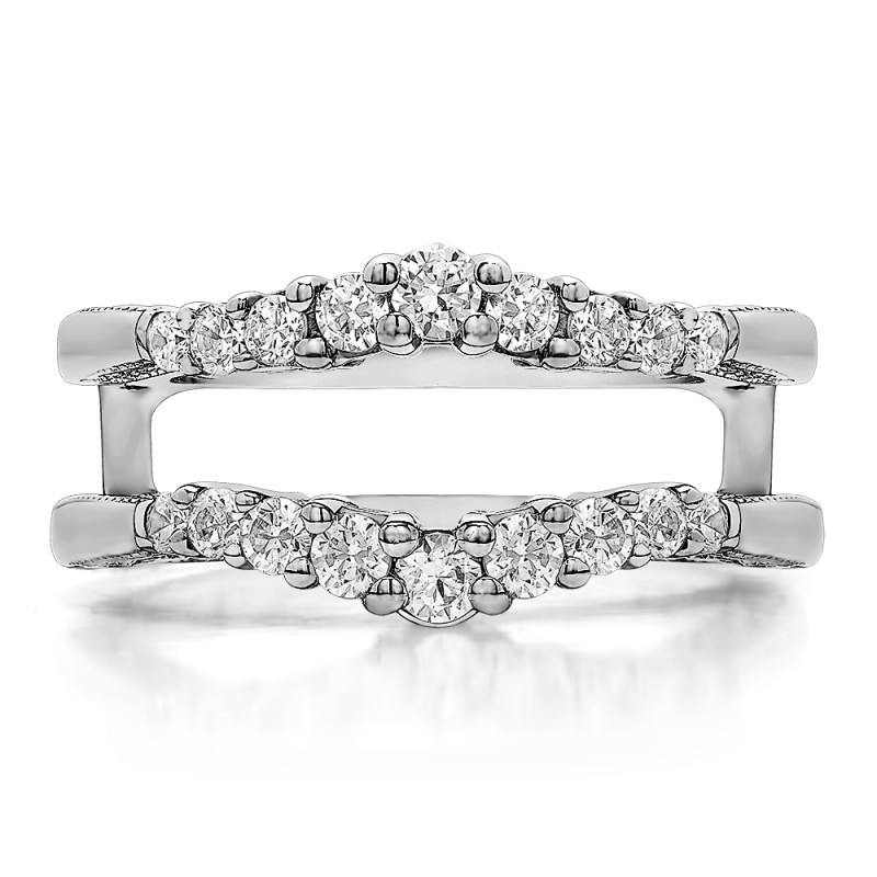 This wedding ring guard has 18 round, prong set stones. Each band measures 2.4 millimeters wide. This ring guard has 0.71 carats total weight. It is made to fit a round solitaire from 0.5 carats to 1 carats.