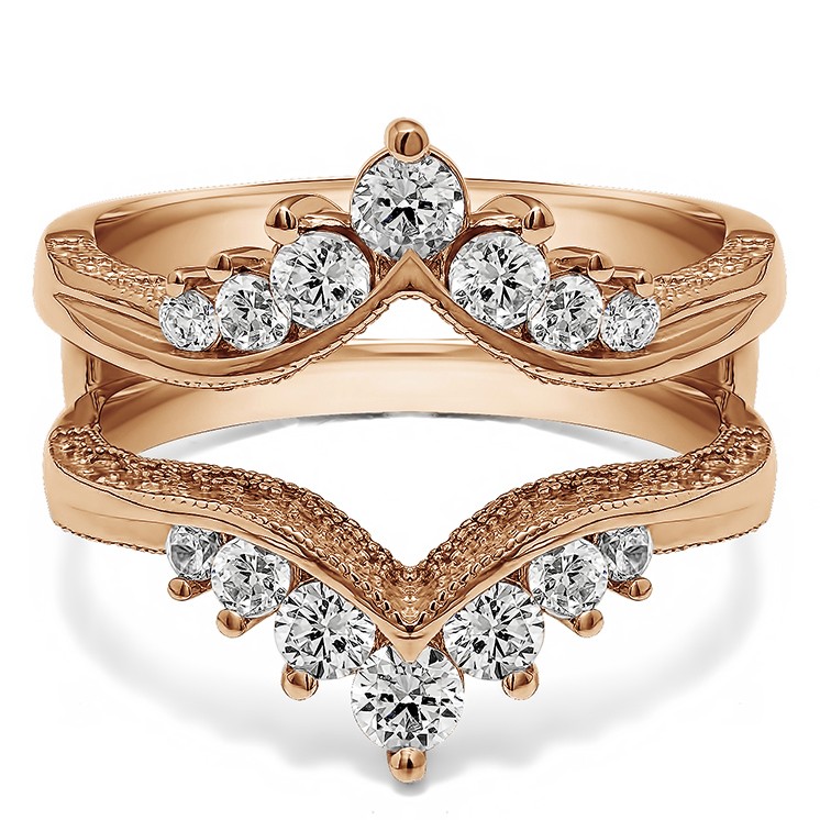This wedding ring guard has 14 round, prong set stones. Each band measures 2.5 millimeters wide. This ring guard has 0.74 carats total weight. It is made to fit a round or princess cut solitaire from 0.5 carats to 2 carats.