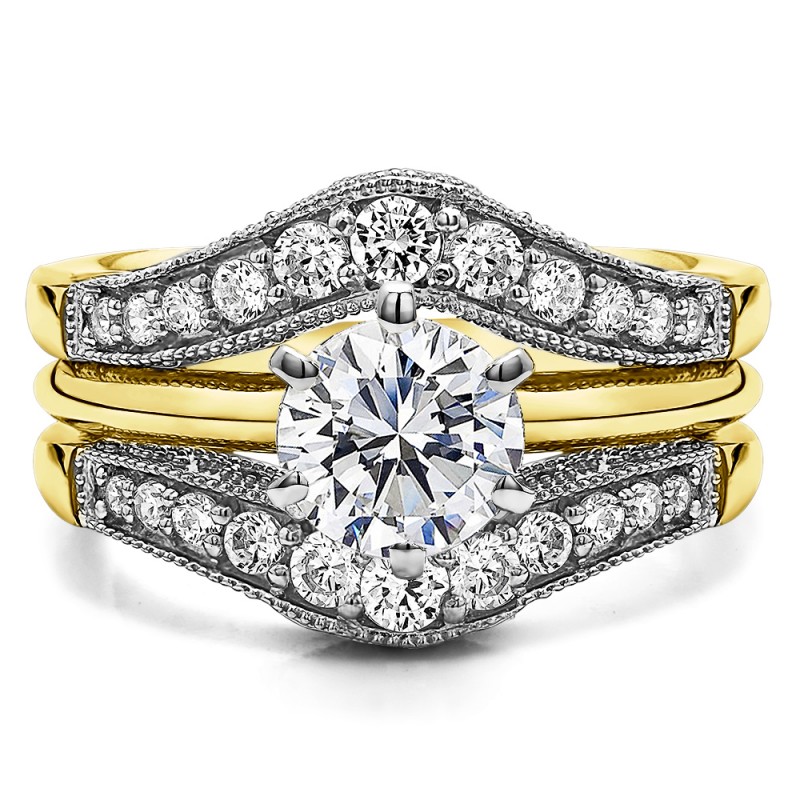 This wedding ring guard has 22 round, channel set stones. Each band measures 2 millimeters wide. This ring guard has 0.75 carats total weight. It is made to fit a round solitaire from 0.5 carats to 2, or a princess or marquise cut solitaire from 0.75 up to 2 carats.