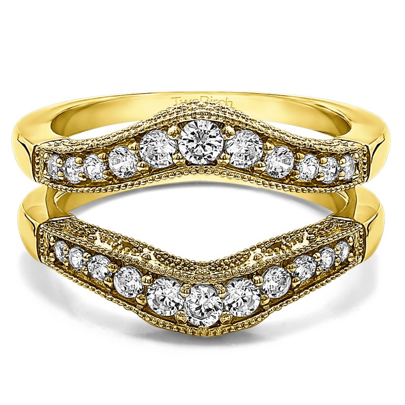 This wedding ring guard has 22 round, channel set stones. Each band measures 2 millimeters wide. This ring guard has 0.75 carats total weight. It is made to fit a round solitaire from 0.5 carats to 2, or a princess or marquise cut solitaire from 0.75 up to 2 carats.