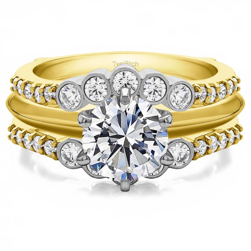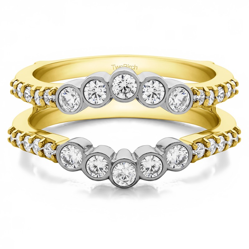 This wedding ring guard has 30 round, prong set stones. Each band measures 2.01 millimeters wide. This ring guard has 0.7 carats total weight. It is made to fit a round solitaire from 0.25 carats to 1.5, or a princess cut solitaire from 0.25 up to 2, or a marquise solitaire from 0.5 up to 1.5 carats.