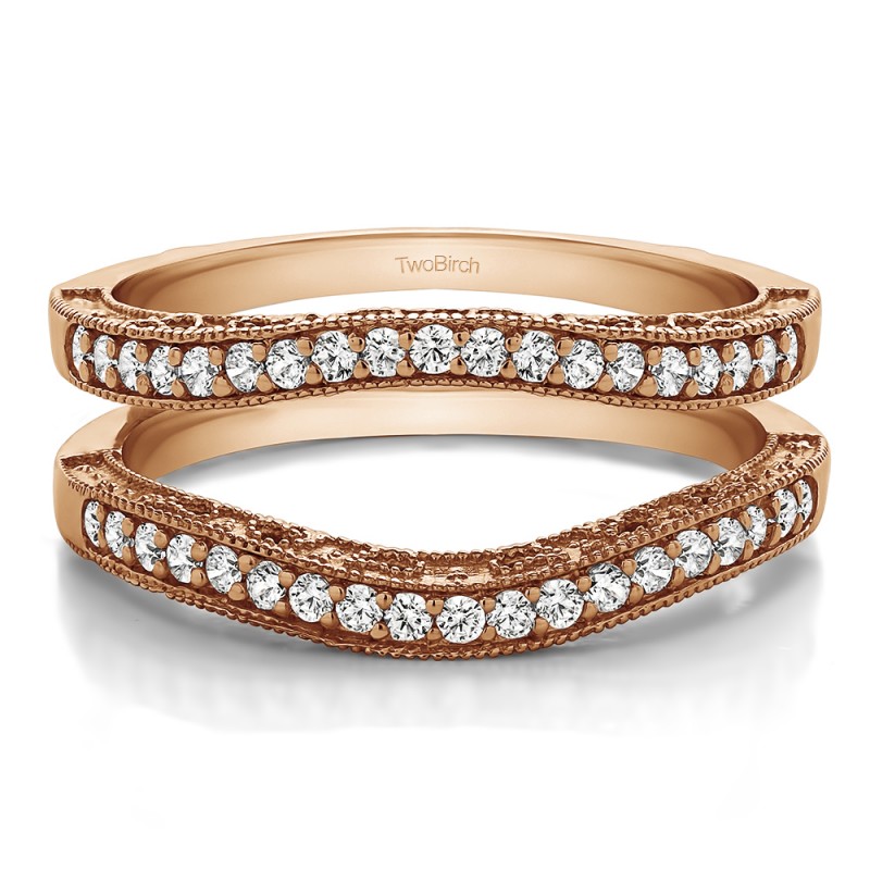 This wedding ring guard has 38 round, prong set stones. Each band measures 2.1 millimeters wide. This ring guard has 0.38 carats total weight. It is made to fit a round solitaire from 0.5 carats to 1.5, or a princess cut solitaire from 0.25 up to 2, or a marquise solitaire from 0.5 up to 1 carats.
