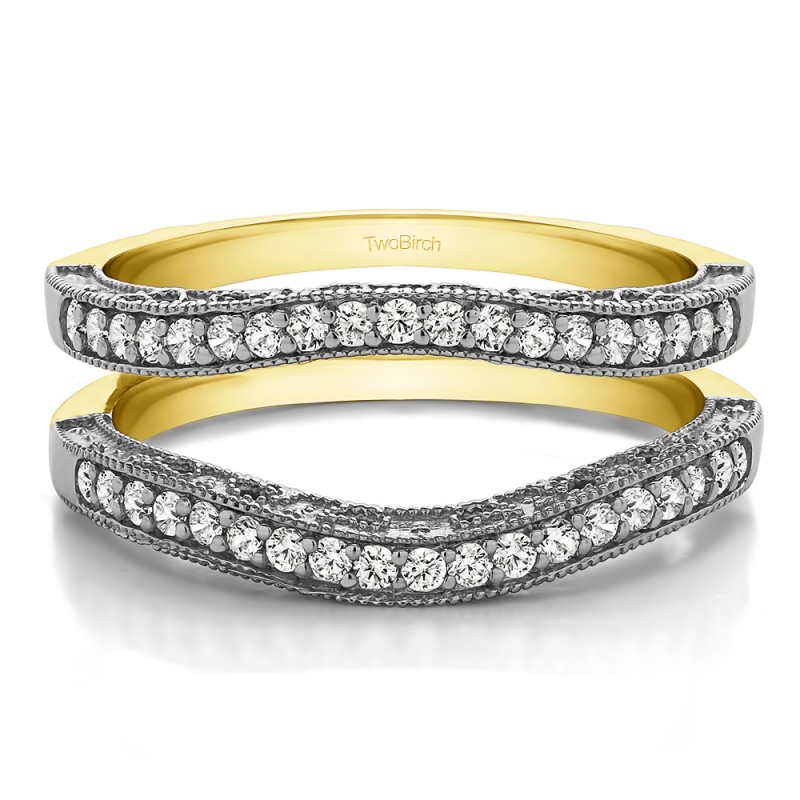 This wedding ring guard has 38 round, prong set stones. Each band measures 2.1 millimeters wide. This ring guard has 0.38 carats total weight. It is made to fit a round solitaire from 0.5 carats to 1.5, or a princess cut solitaire from 0.25 up to 2, or a marquise solitaire from 0.5 up to 1 carats.