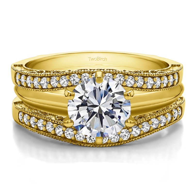 This wedding ring guard has 38 round, prong set stones. Each band measures 2.1 millimeters wide. This ring guard has 0.38 carats total weight. It is made to fit a round solitaire from 0.5 carats to 1.5, or a princess cut solitaire from 0.25 up to 2, or a marquise solitaire from 0.5 up to 1 carats.