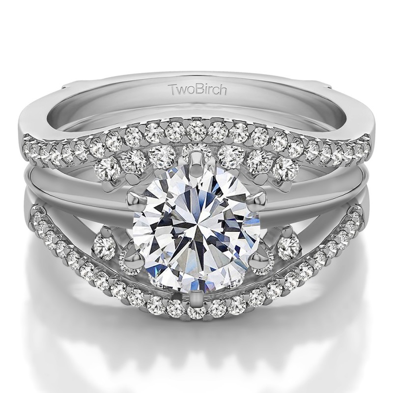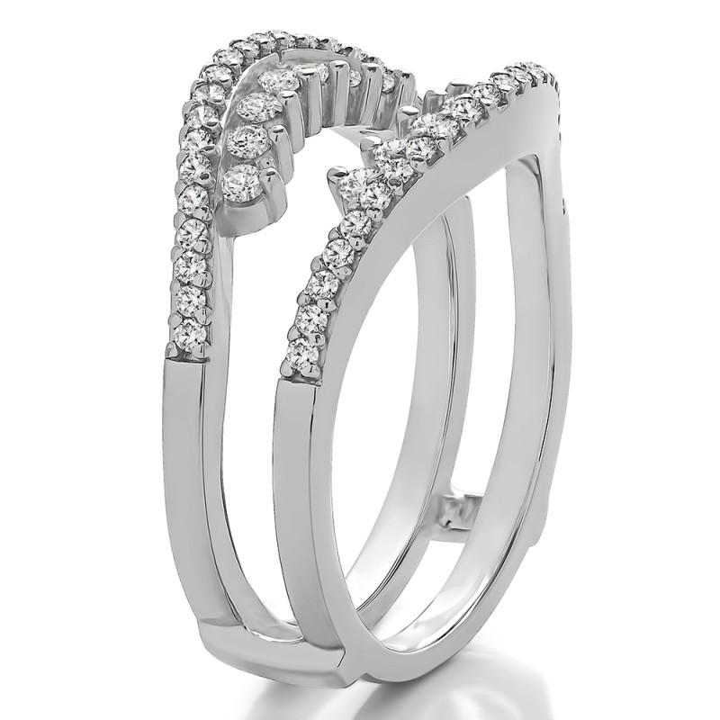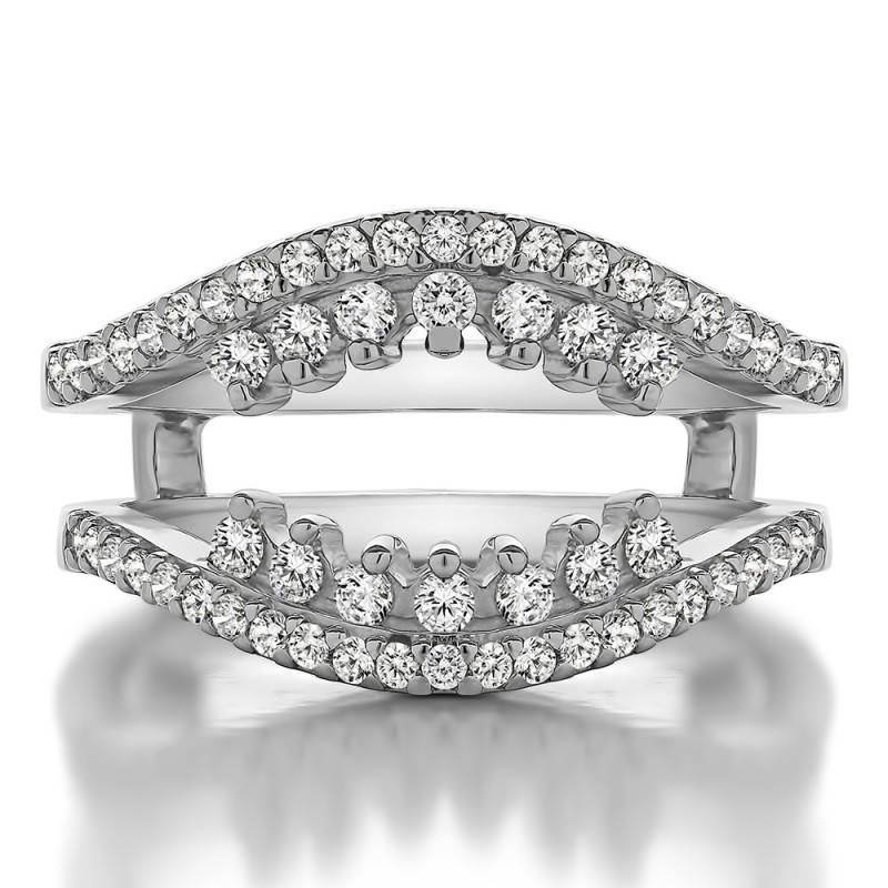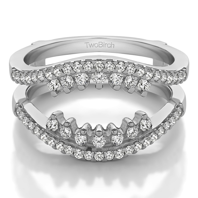 This wedding ring guard has 60 round, prong set stones. Each band measures 1.9 millimeters wide. This ring guard has 0.49 carats total weight. It is made to fit a round or princess cut solitaire from 0.5 carats to 2 carats.