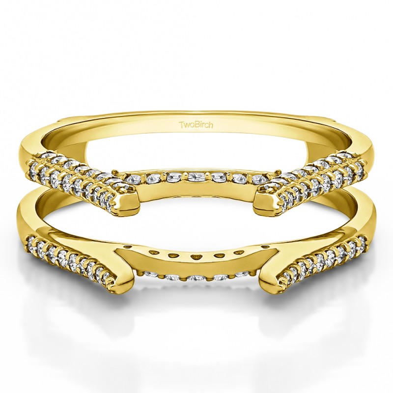 This wedding ring guard has 82 round, prong set stones. Each band measures 1.33 millimeters wide. This ring guard has 0.42 carats total weight. It is made to fit a round solitaire from 0.5 carats to 2, or a princess or marquise cut solitaire from 0.5 up to 1.5 carats.