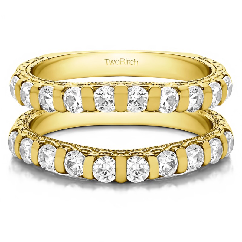 This wedding ring guard has 20 round, channel set stones. Each band measures 2.7 millimeters wide. This ring guard has 1 carats total weight. It is made to fit a round solitaire from 0.25 carats to 1.5, or a princess cut solitaire from 0.25 up to 2, or a marquise solitaire from 0.5 up to 1.5 carats.