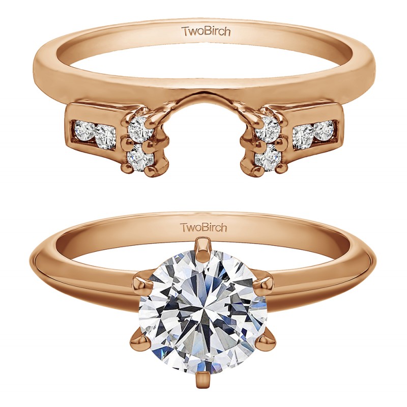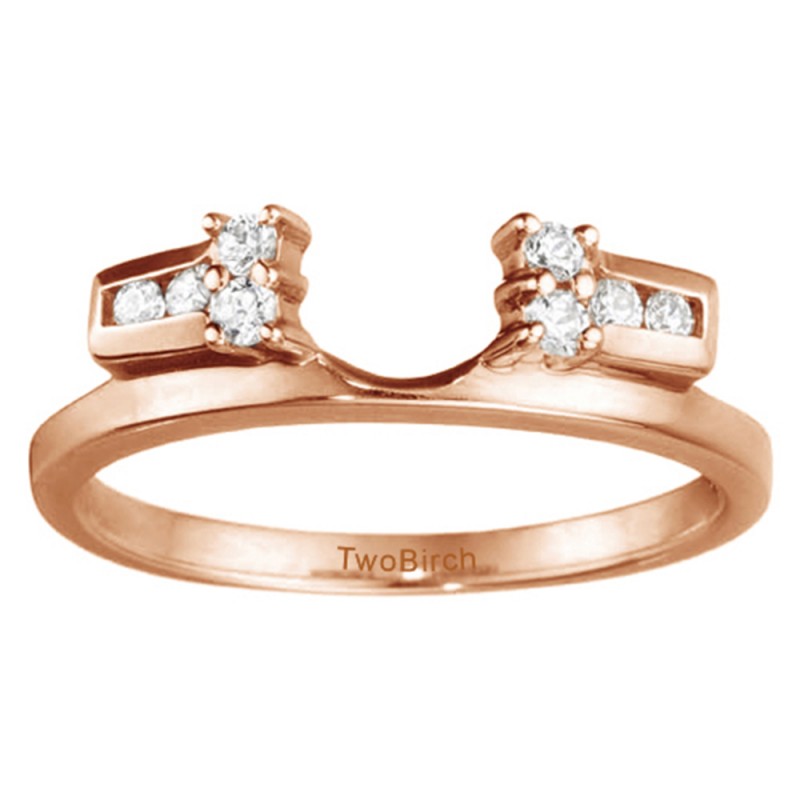 This ring wrap has 8 round, prong set stones with a total combined weight of 0.16 carats. It has a total width of 2 millimeters and has a mix of channel and prong set stones with a traditional high polish finish. This ring wrap is made to fit a round solitaire from 0.5 carat up to 1 carat, or a marquise solitaire from 0.25 carat up to 0.5 carat, or a princess solitaire from 0.5 carat up to 1 carat.