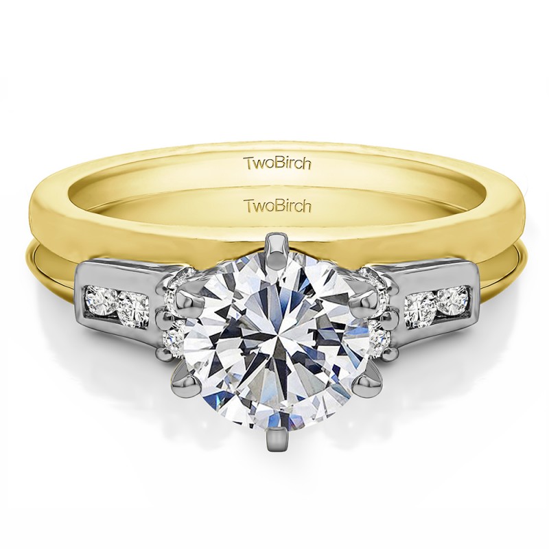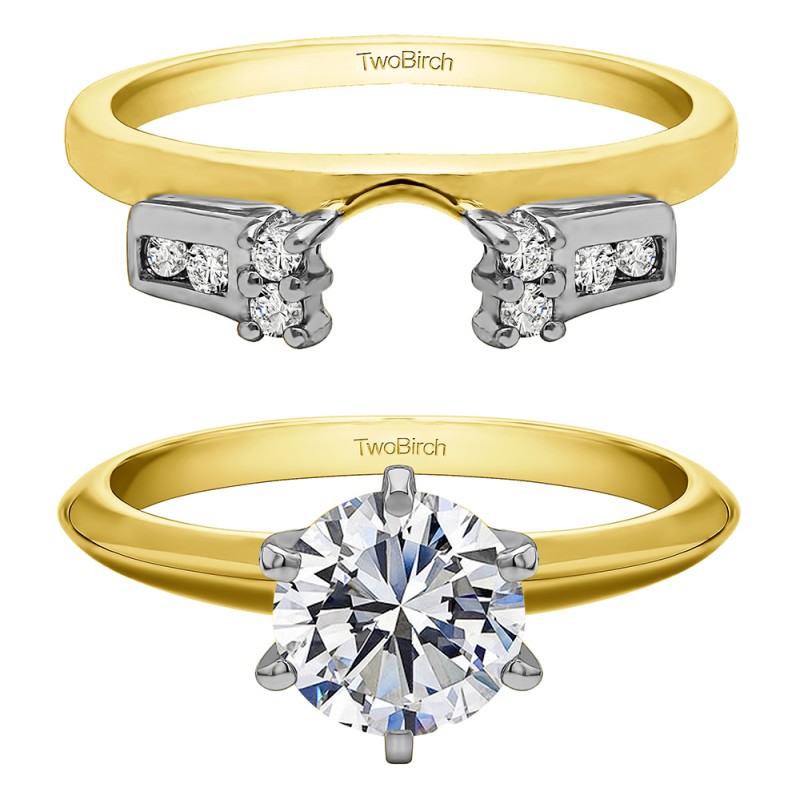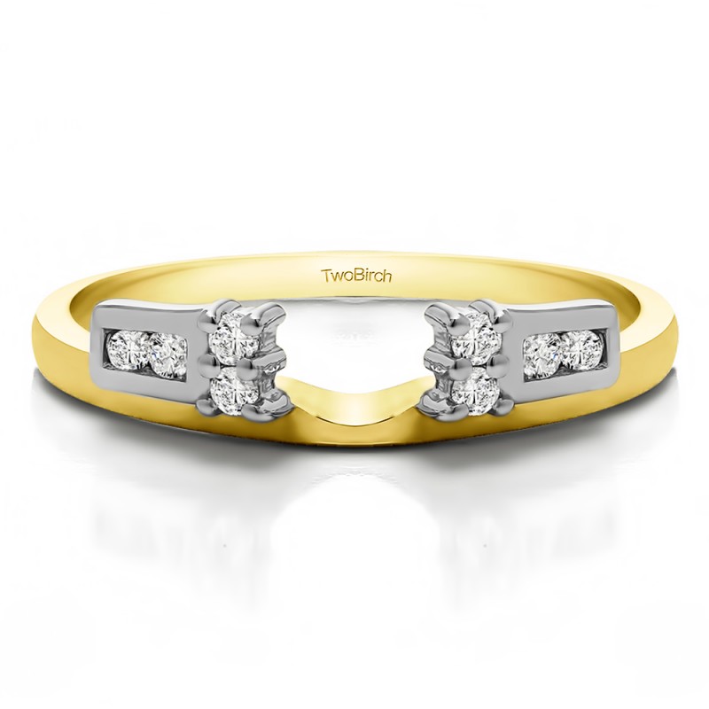 This ring wrap has 8 round, prong set stones with a total combined weight of 0.16 carats. It has a total width of 2 millimeters and has a mix of channel and prong set stones with a traditional high polish finish. This ring wrap is made to fit a round solitaire from 0.5 carat up to 1 carat, or a marquise solitaire from 0.25 carat up to 0.5 carat, or a princess solitaire from 0.5 carat up to 1 carat.