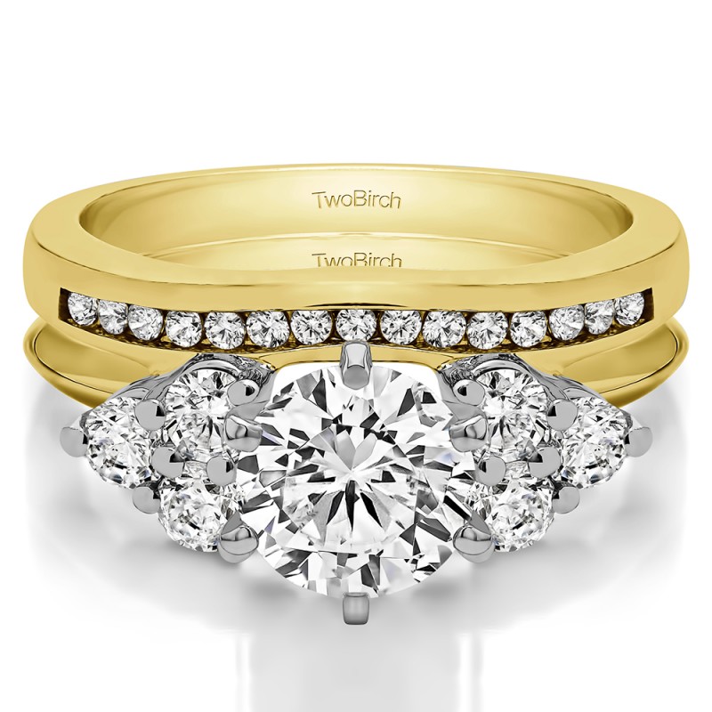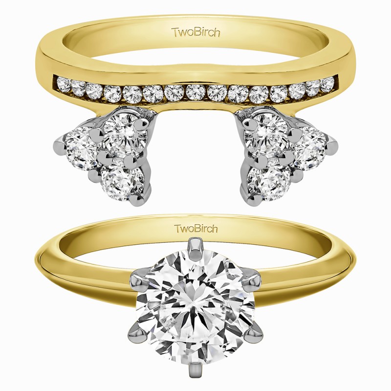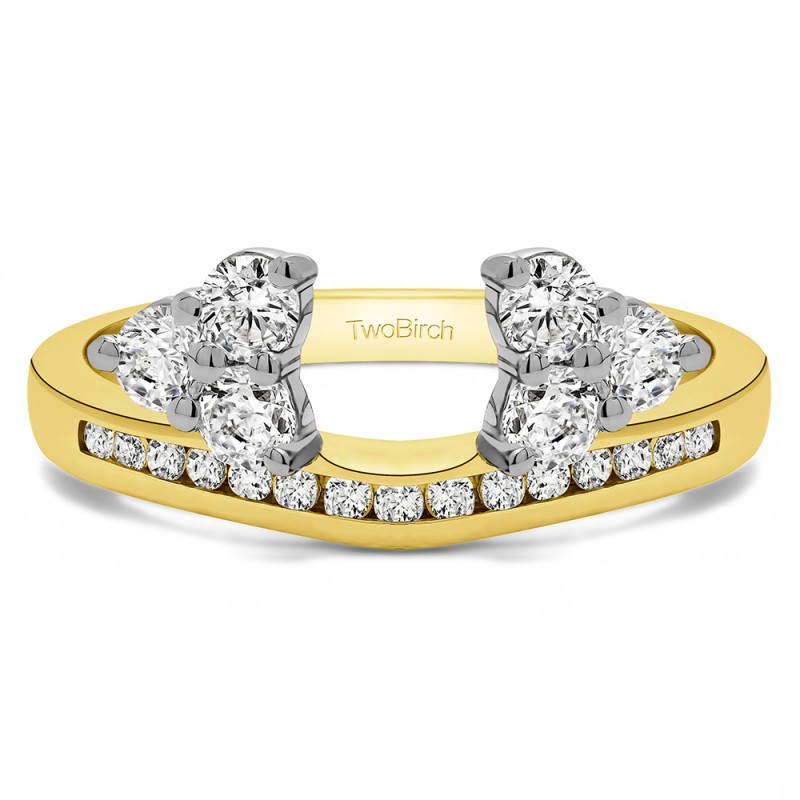 This ring wrap has 21 stones in total. It features a mix of round and round prong set stones with a total combined weight of 0.25 carats. It has a total width of 2 millimeters. It on this anniversary wrap is contoured and channel set with round stones. It also features prong set clusters of round stones with a high polish finish. This ring wrap is made to fit a round solitaire from 0.2 carat up to 0.3 carat, or a marquise solitaire from 0.25 carat up to 0.5 carat, or a princess solitaire from 0.2 carat up to 0.3 carat.