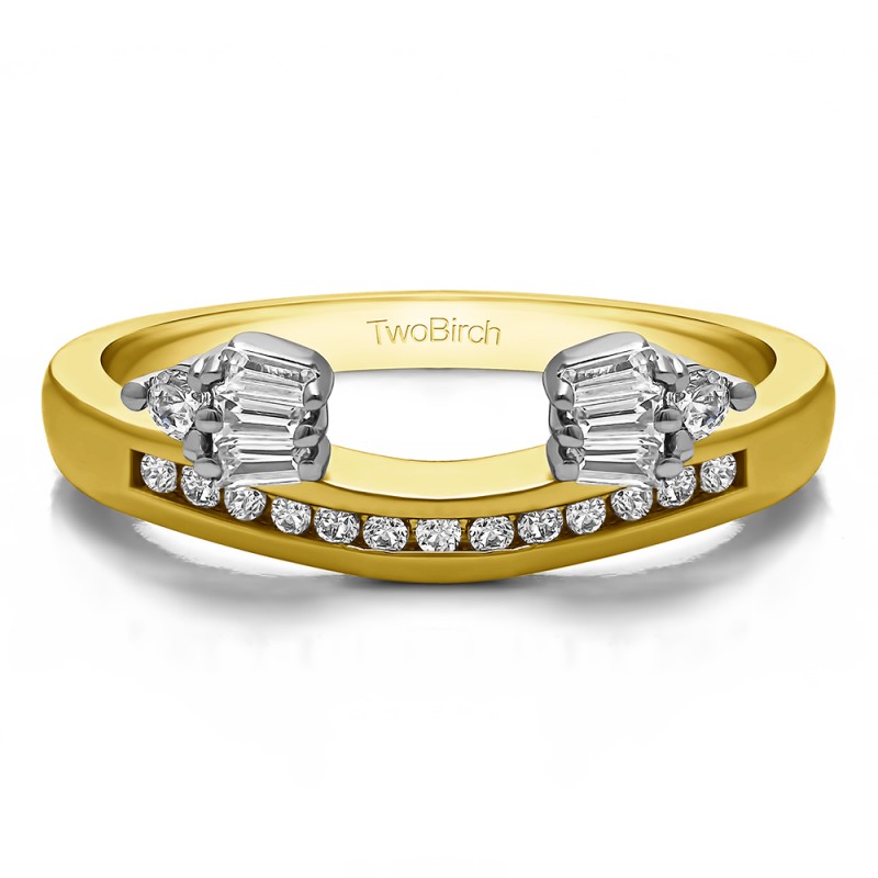 This ring wrap has 21 stones in total. It features a mix of baguette and round prong set stones with a total combined weight of 0.26 carats. It has a total width of 2 millimeters. It on this anniversary wrap is contoured and detailed with tapered baguettes. This ring wrap is made to fit a round solitaire from 0.5 carat up to 1.5 carat, or a marquise solitaire from 0.25 carat up to 0.5 carat, or a princess solitaire from 0.5 carat up to 1 carat.