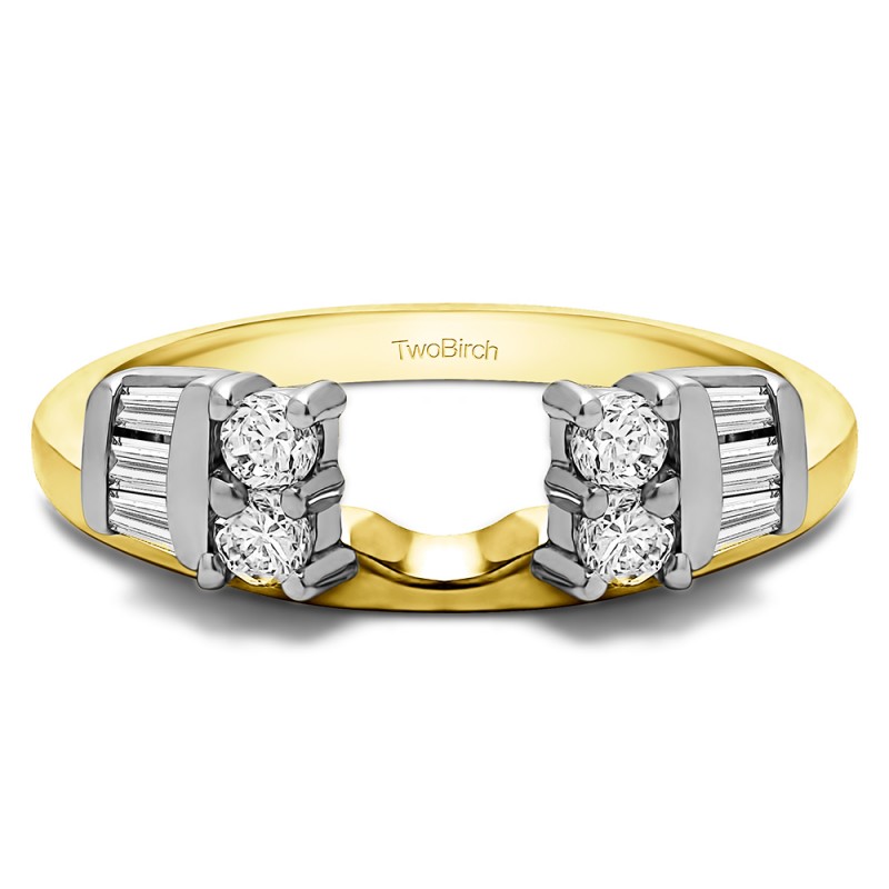 This ring wrap has 10 stones in total. It features a mix of round and baguette prong set stones with a total combined weight of 0.32 carats. It has a total width of 2 millimeters and has a mix of baguettes and round with a high polish finish. This ring wrap is made to fit a round solitaire from 0.75 carat up to 1 carat, or a marquise solitaire from 0.25 carat up to 0.5 carat, or a princess solitaire from 0.75 carat up to 1 carat.