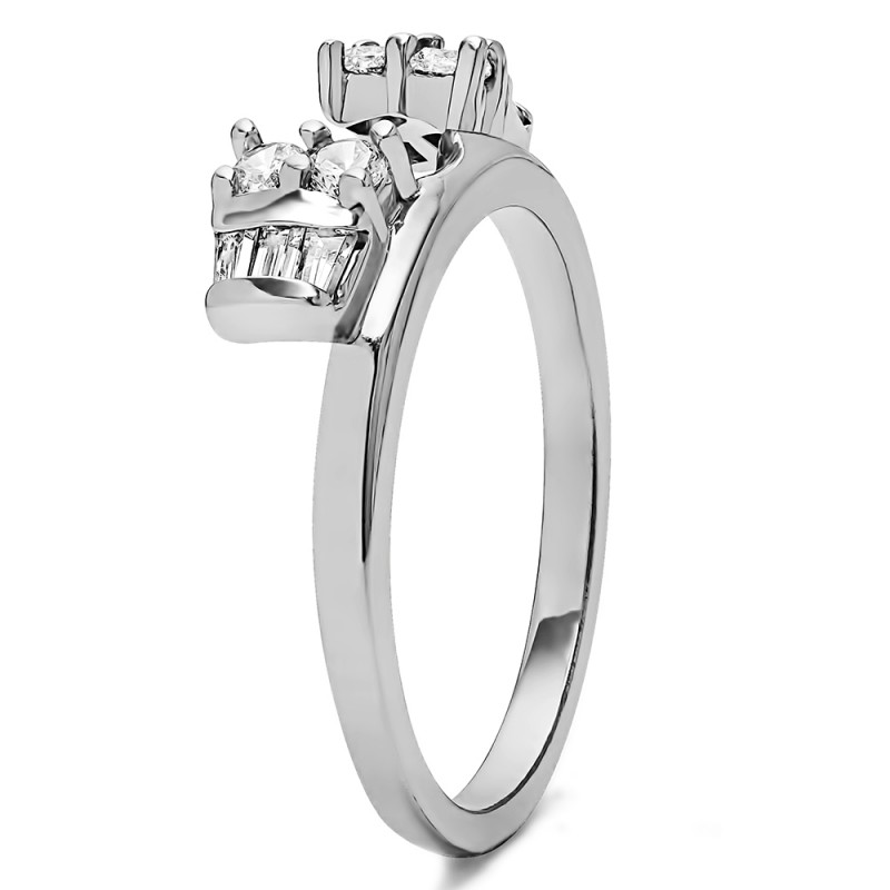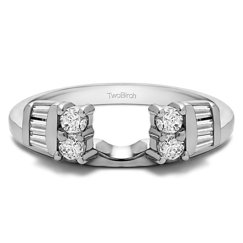 This ring wrap has 10 stones in total. It features a mix of round and baguette prong set stones with a total combined weight of 0.32 carats. It has a total width of 2 millimeters and has a mix of baguettes and round with a high polish finish. This ring wrap is made to fit a round solitaire from 0.75 carat up to 1 carat, or a marquise solitaire from 0.25 carat up to 0.5 carat, or a princess solitaire from 0.75 carat up to 1 carat.