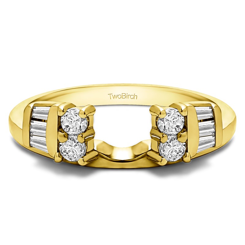 This ring wrap has 10 stones in total. It features a mix of round and baguette prong set stones with a total combined weight of 0.32 carats. It has a total width of 2 millimeters and has a mix of baguettes and round with a high polish finish. This ring wrap is made to fit a round solitaire from 0.75 carat up to 1 carat, or a marquise solitaire from 0.25 carat up to 0.5 carat, or a princess solitaire from 0.75 carat up to 1 carat.