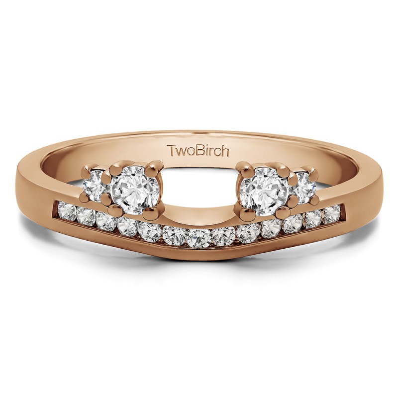 This ring wrap has 17 stones in total. It features a mix of round and round prong set stones with a total combined weight of 0.34 carats. It has a total width of 2 millimeters and features a row of round channel set stones on the band and four round prong set stones. Once you add your solitaire, it will create the look of an engagement ring with a matching channel set band. This ring wrap is made to fit a round solitaire from 0.3 carat up to 2 carat, or a marquise solitaire from 0.25 carat up to 0.5 carat, or a princess solitaire from 0.25 carat up to 0.5 carat.