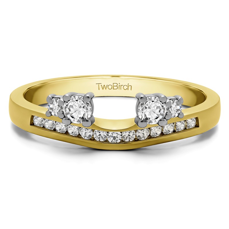This ring wrap has 17 stones in total. It features a mix of round and round prong set stones with a total combined weight of 0.34 carats. It has a total width of 2 millimeters and features a row of round channel set stones on the band and four round prong set stones. Once you add your solitaire, it will create the look of an engagement ring with a matching channel set band. This ring wrap is made to fit a round solitaire from 0.3 carat up to 2 carat, or a marquise solitaire from 0.25 carat up to 0.5 carat, or a princess solitaire from 0.25 carat up to 0.5 carat.
