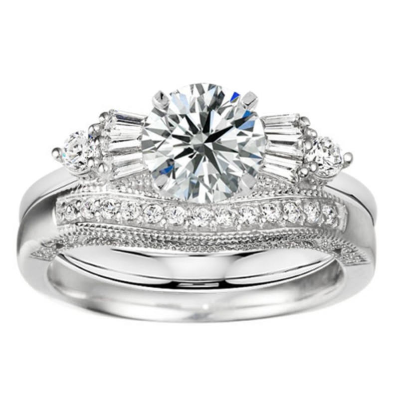 This ring wrap has 21 stones in total. It features a mix of round and baguette channel set stones with a total combined weight of 0.39 carats. It has a total width of 2.4 millimeters and features a channel set row of round stones with millgrained edges and filigree cut out designs on the profile of the band. This ring wrap is made to fit a round solitaire from 0.5 carat up to 0.75 carat, or a marquise solitaire from 0.25 carat up to 0.5 carat, or a princess solitaire from 0.5 carat up to 1 carat.