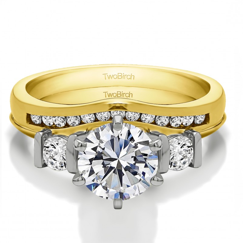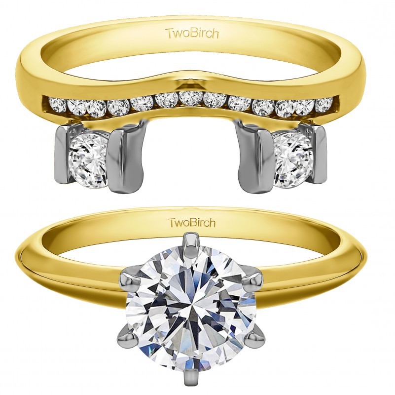 This ring wrap has 15 stones in total. It features a mix of round and round bar set stones with a total combined weight of 0.42 carats. It has a total width of 2.5 millimeters and features a row of channel set stones on the band and two bar set stones. Once you add your solitaire, it will create the look of a three stone engagement ring with a matching channel set band. This ring wrap is made to fit a round solitaire from 0.75 carat up to 2 carat, or a marquise solitaire from 0.25 carat up to 0.5 carat, or a princess solitaire from 0.75 carat up to 2 carat.
