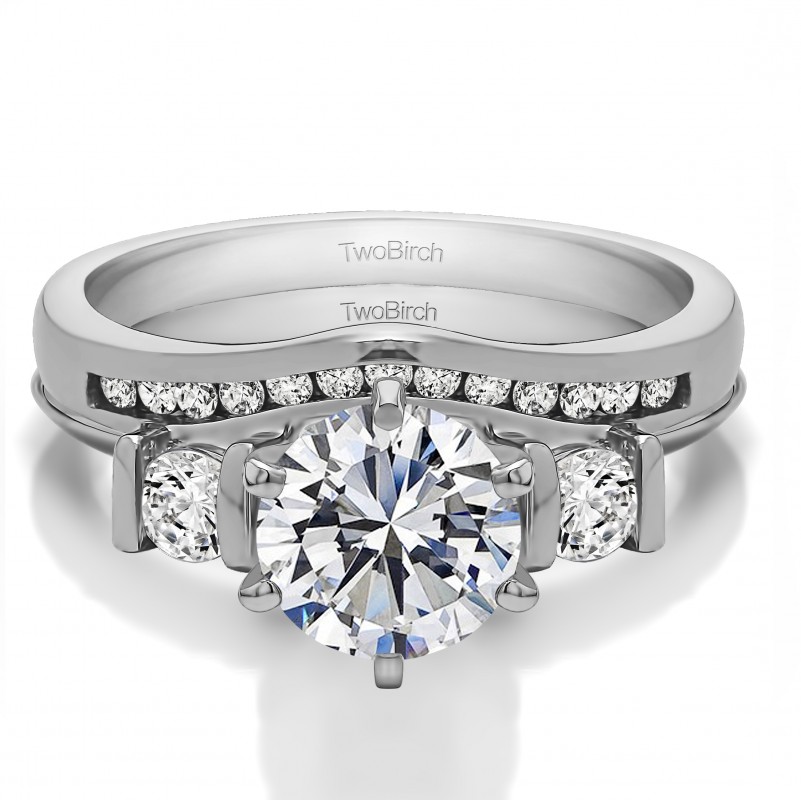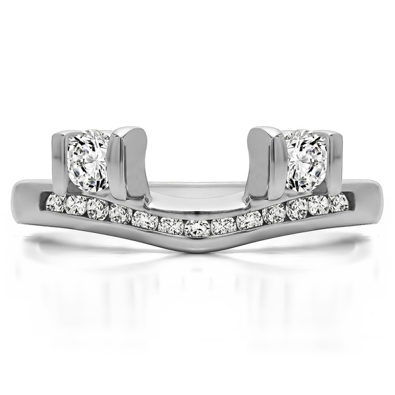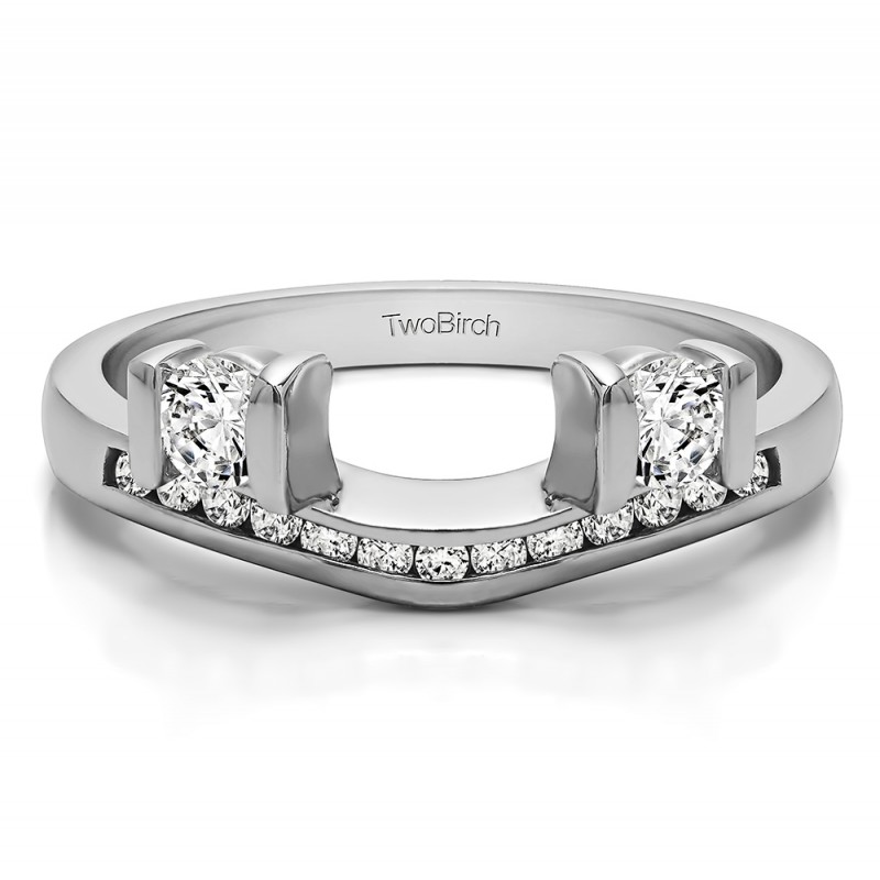 This ring wrap has 15 stones in total. It features a mix of round and round bar set stones with a total combined weight of 0.42 carats. It has a total width of 2.5 millimeters and features a row of channel set stones on the band and two bar set stones. Once you add your solitaire, it will create the look of a three stone engagement ring with a matching channel set band. This ring wrap is made to fit a round solitaire from 0.75 carat up to 2 carat, or a marquise solitaire from 0.25 carat up to 0.5 carat, or a princess solitaire from 0.75 carat up to 2 carat.