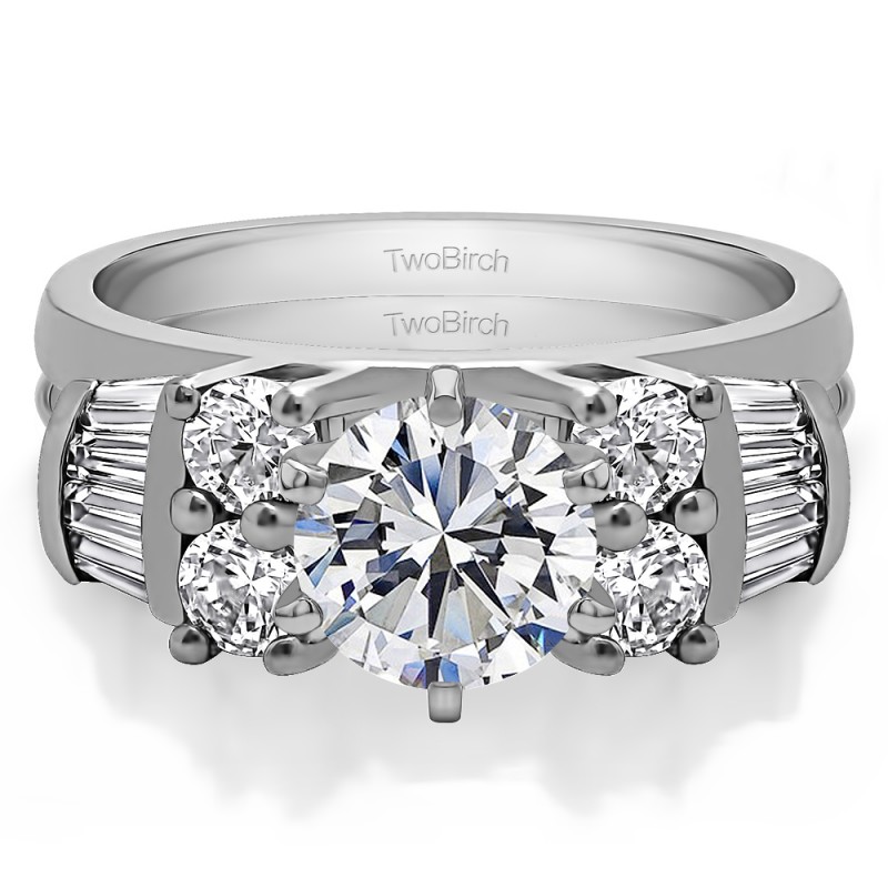 This ring wrap has 12 stones in total. It features a mix of round and baguette prong set stones with a total combined weight of 0.48 carats. It has a total width of 2 millimeters and has a mix of baguettes and round with a high polish finish. This ring wrap is made to fit a round solitaire from 0.75 carat up to 1 carat, or a marquise solitaire from 0.25 carat up to 0.5 carat, or a princess solitaire from 0.75 carat up to 1 carat.