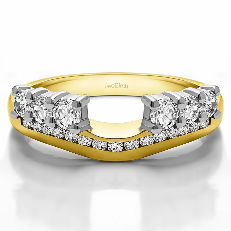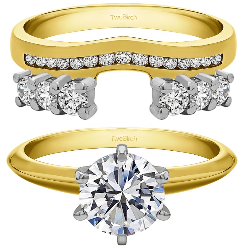 This ring wrap has 21 stones in total. It features a mix of round and round prong set stones with a total combined weight of 0.49 carats. It has a total width of 2 millimeters and features a row of round channel set stones on the band and six round prong set stones. Once you add your solitaire, it will create the look of an engagement ring with a matching channel set band. This ring wrap is made to fit a round solitaire from 1 carat up to 1.5 carat, or a marquise solitaire from 0.25 carat up to 0.5 carat, or a princess solitaire from 1 carat up to 1.5 carat.