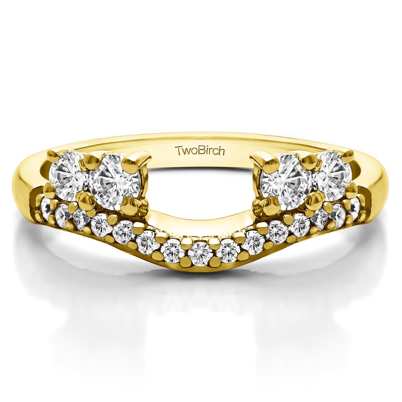 This ring wrap has 19 round, prong set stones with a total combined weight of 0.49 carats. It has a total width of 2 millimeters and features a contoured band with shared progs and four graduated stones, prong set. When combined with a solitaire, it created a perfectly matched bridal set consisting of curved ring and engagement ring. This ring wrap is made to fit a round solitaire from 0.5 carat up to 2 carat, or a marquise solitaire from 0.25 carat up to 0.5 carat, or a princess solitaire from 0.5 carat up to 1 carat.