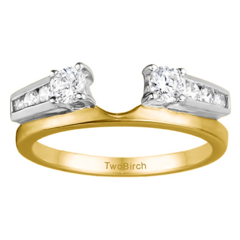 This ring wrap has 8 stones in total. It features a mix of round and round prong set stones with a total combined weight of 0.5 carats. It has a total width of 2 millimeters and has a traditional high polish finish. This ring wrap is made to fit a round solitaire from 0.75 carat up to 2 carat, or a marquise solitaire from 0.25 carat up to 0.5 carat, or a princess solitaire from 0.5 carat up to 0.75 carat.