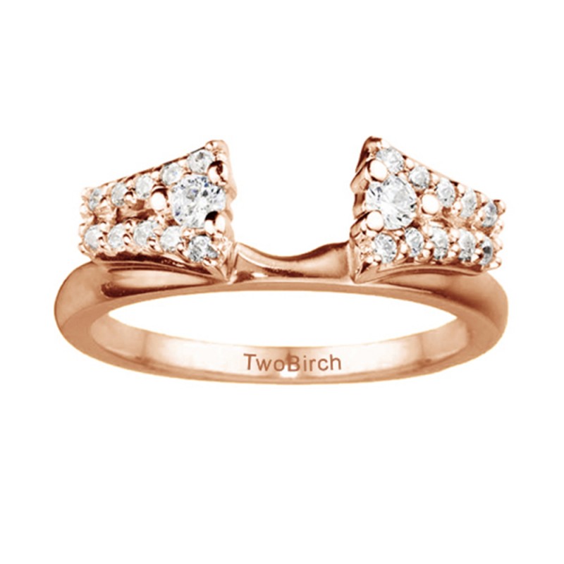 This ring wrap has 22 round, prong set stones with a total combined weight of 0.5 carats. It has a total width of 2 millimeters and has a double row of shared prong set stones with one larger one at the top, near the center. This ring wrap is made to fit a round solitaire from 0.75 carat up to 1.5 carat, or a marquise solitaire from 0.25 carat up to 0.5 carat, or a princess solitaire from 0.75 carat up to 1 carat.