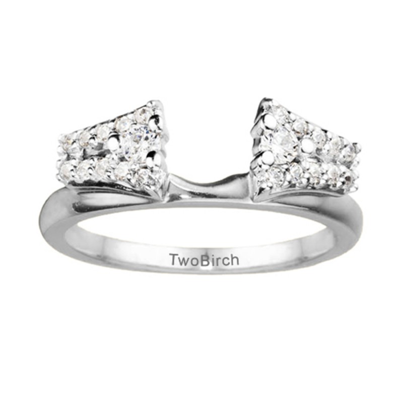 This ring wrap has 22 round, prong set stones with a total combined weight of 0.5 carats. It has a total width of 2 millimeters and has a double row of shared prong set stones with one larger one at the top, near the center. This ring wrap is made to fit a round solitaire from 0.75 carat up to 1.5 carat, or a marquise solitaire from 0.25 carat up to 0.5 carat, or a princess solitaire from 0.75 carat up to 1 carat.
