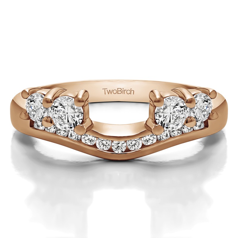 This ring wrap has 17 stones in total. It features a mix of round and round prong set stones with a total combined weight of 0.5 carats. It has a total width of 2 millimeters and features a row of round channel set stones on the band and four round prong set stones. Once you add your solitaire, it will create the look of an engagement ring with a matching channel set band. This ring wrap is made to fit a round solitaire from 0.5 carat up to 1 carat, or a marquise solitaire from 0.25 carat up to 0.5 carat, or a princess solitaire from 0.5 carat up to 1 carat.
