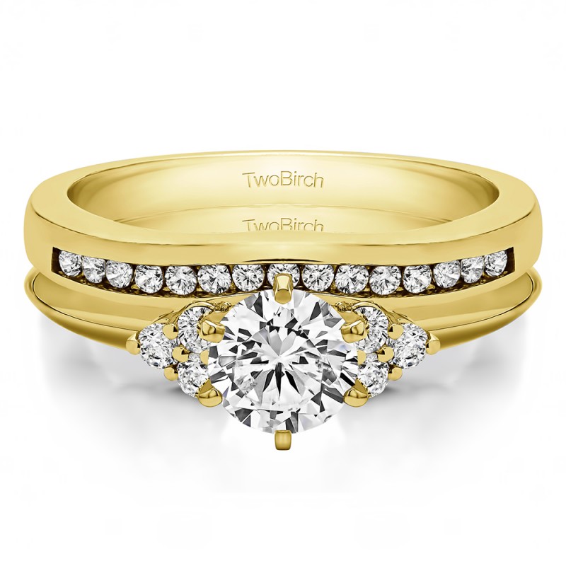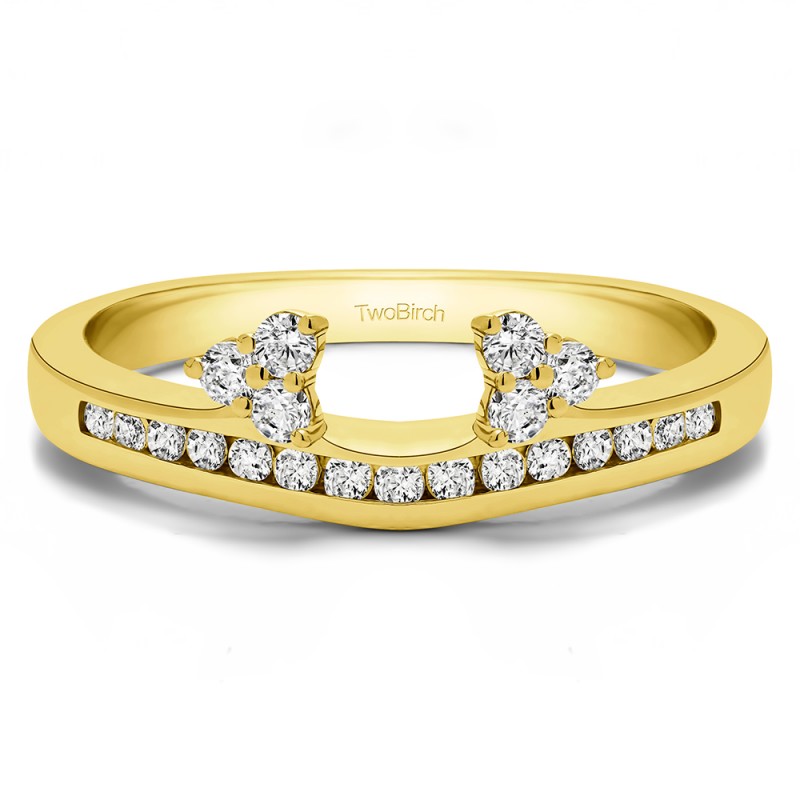 This ring wrap has 21 stones in total. It features a mix of round and round prong set stones with a total combined weight of 0.51 carats. It has a total width of 2 millimeters. It on this anniversary wrap is contoured and channel set with round stones. It also features prong set clusters of round stones with a high polish finish. This ring wrap is made to fit a round solitaire from 1 carat up to 2 carat, or a marquise solitaire from 0.25 carat up to 0.5 carat, or a princess solitaire from 0.75 carat up to 1.5 carat.