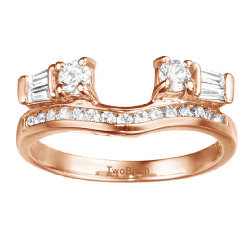 This ring wrap has 21 stones in total. It features a mix of round and round channel set stones with a total combined weight of 0.65 carats. It has a total width of 2.4 millimeters and features a contoured channel set row of round stones accented with bar set tapered baguettes and a prong set round stone on each side. This ring wrap is made to fit a round solitaire from 0.25 carat up to 0.75 carat, or a marquise solitaire from 0.25 carat up to 0.5 carat, or a princess solitaire from 0.5 carat up to 0.75 carat.