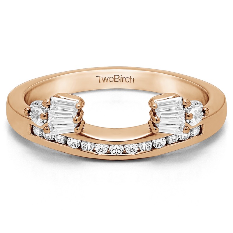 This ring wrap has 21 stones in total. It features a mix of baguette and round prong set stones with a total combined weight of 0.71 carats. It has a total width of 2 millimeters. It on this anniversary wrap is contoured and detailed with tapered baguettes. This ring wrap is made to fit a round solitaire from 1 carat up to 1.5 carat, or a marquise solitaire from 0.25 carat up to 0.5 carat, or a princess solitaire from 1 carat up to 1.5 carat.