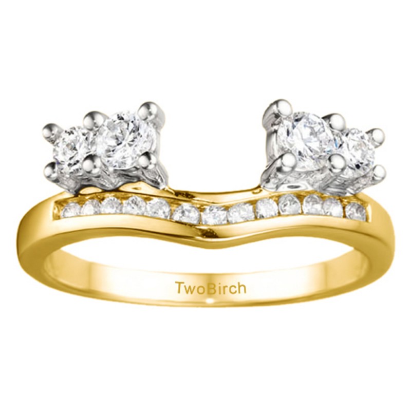 This ring wrap has 19 stones in total. It features a mix of round and round prong set stones with a total combined weight of 0.73 carats. It has a total width of 2.4 millimeters and features a row of round channel set stones on the band and four round prong set stones. Once you add your solitaire, it will create the look of an engagement ring with a matching channel set band. This ring wrap is made to fit a round solitaire from 0.5 carat up to 0.75 carat, or a marquise solitaire from 0.25 carat up to 0.5 carat, or a princess solitaire from 0.5 carat up to 1 carat.