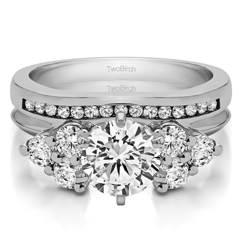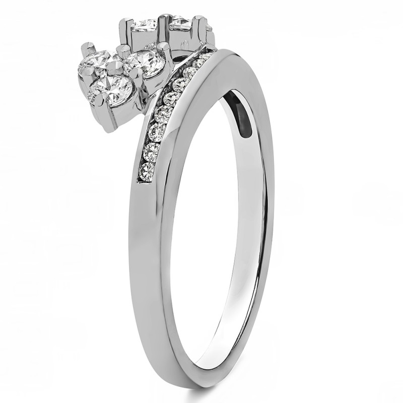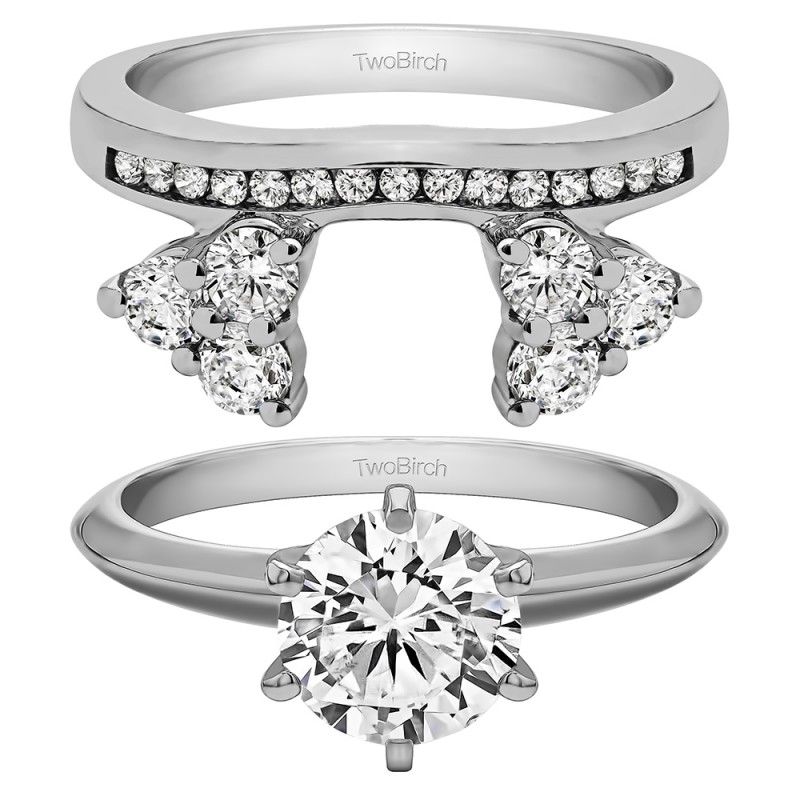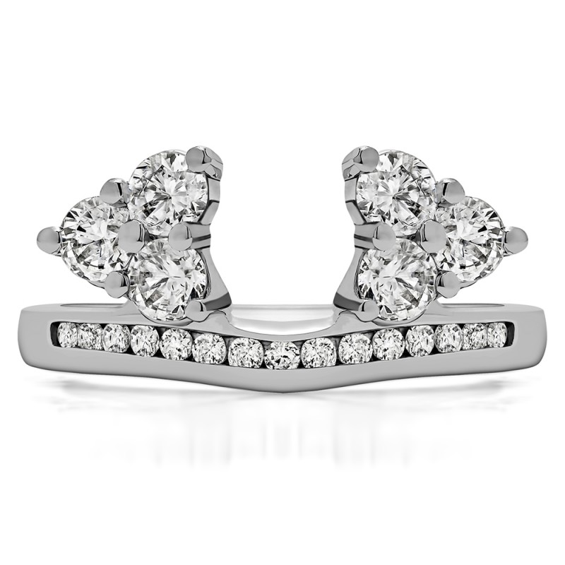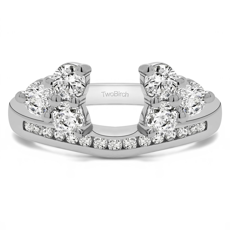 This ring wrap has 22 stones in total. It features a mix of round and round prong set stones with a total combined weight of 0.75 carats. It has a total width of 2 millimeters. It on this anniversary wrap is contoured and channel set with round stones. It also features prong set clusters of round stones with a high polish finish. This ring wrap is made to fit a round solitaire from 1 carat up to 1.5 carat, or a marquise solitaire from 0.25 carat up to 0.5 carat, or a princess solitaire from 1 carat up to 1.5 carat.