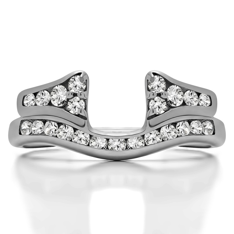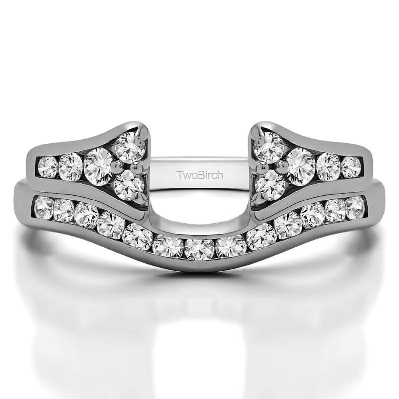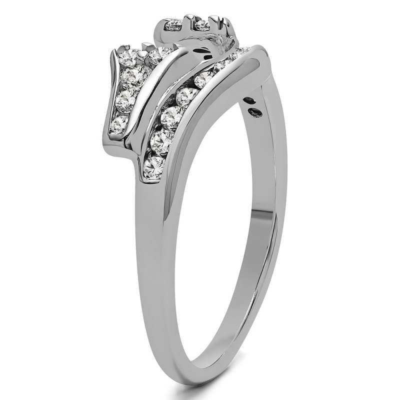 This ring wrap has 23 round, channel set stones with a total combined weight of 0.76 carats. It has a total width of 2.5 millimeters and features a row of round channel set stones on the band and a cluster of round stones that adorn the center opening. Once you add your solitaire, it will create the look of an engagement ring with a matching channel set band. This ring wrap is made to fit a round solitaire from 0.75 carat up to 2 carat, or a marquise solitaire from 0.25 carat up to 0.5 carat, or a princess solitaire from 0.75 carat up to 2 carat.