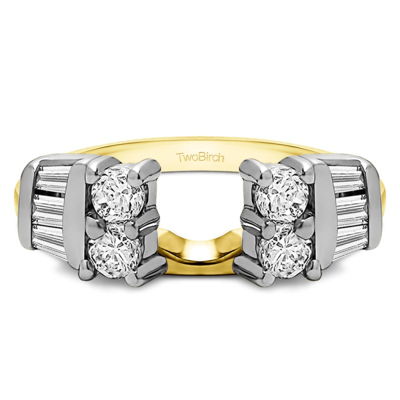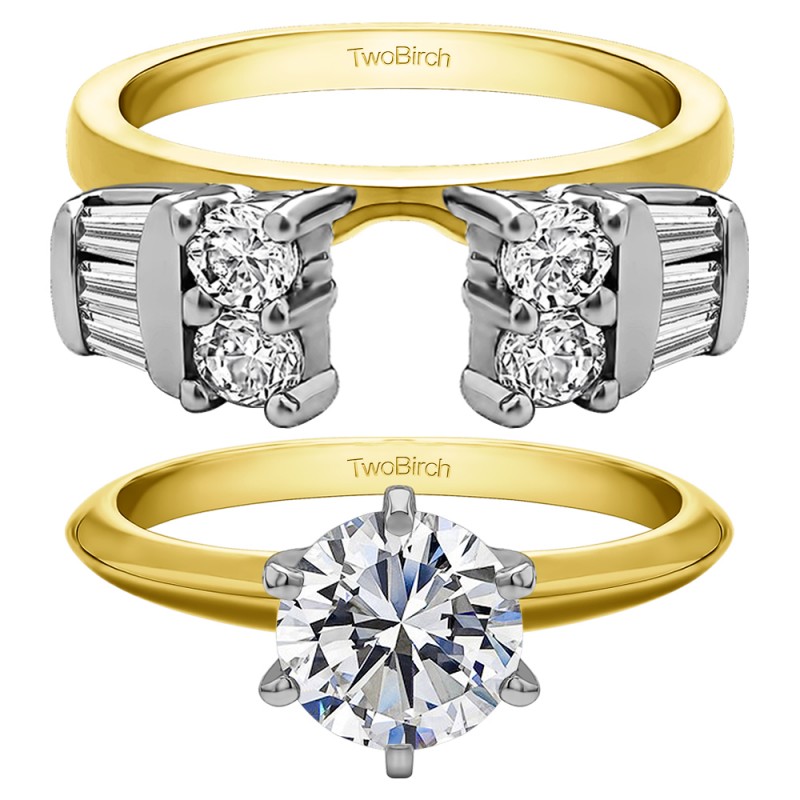 This ring wrap has 12 stones in total. It features a mix of round and baguette prong set stones with a total combined weight of 0.86 carats. It has a total width of 2.1 millimeters and has a mix of baguettes and round with a high polish finish. This ring wrap is made to fit a round solitaire from 0.75 carat up to 1 carat, or a marquise solitaire from 0.25 carat up to 0.5 carat, or a princess solitaire from 0.75 carat up to 1 carat.