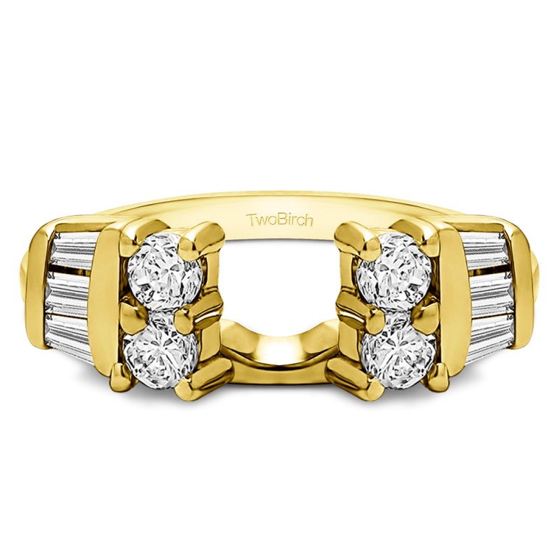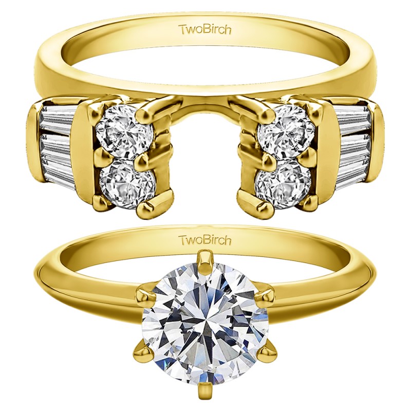 This ring wrap has 12 stones in total. It features a mix of round and baguette prong set stones with a total combined weight of 0.86 carats. It has a total width of 2.1 millimeters and has a mix of baguettes and round with a high polish finish. This ring wrap is made to fit a round solitaire from 0.75 carat up to 1 carat, or a marquise solitaire from 0.25 carat up to 0.5 carat, or a princess solitaire from 0.75 carat up to 1 carat.
