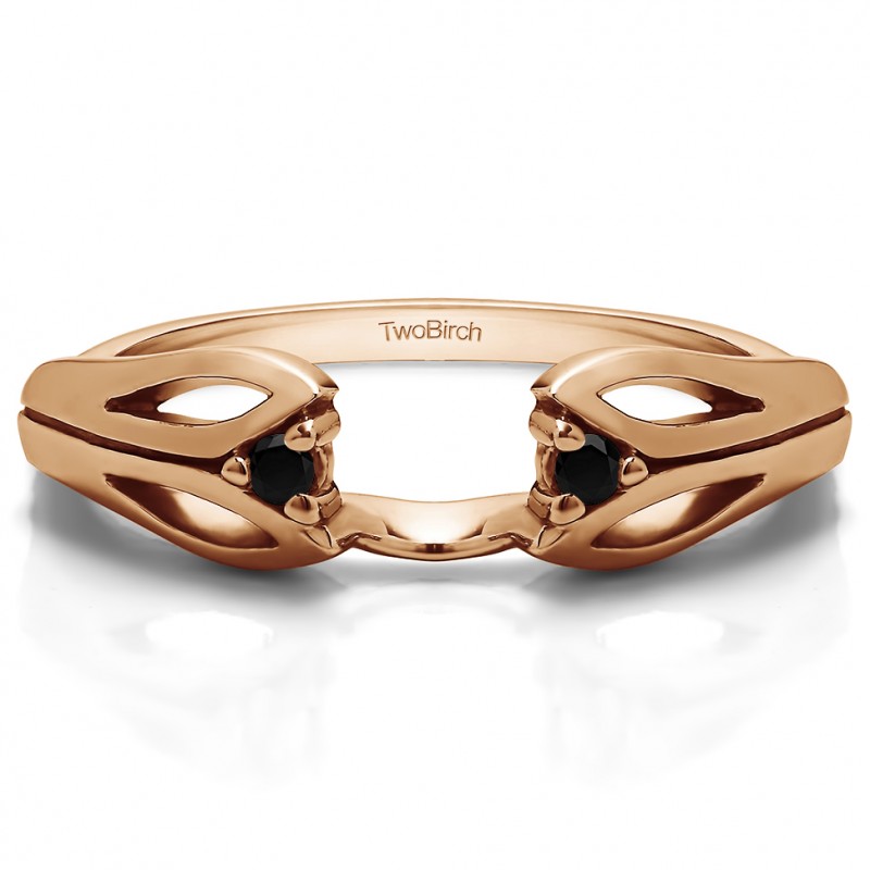 This ring wrap has 2 round, prong set stones with a total combined weight of 0.04 carats. It has a total width of 2 millimeters. Each cut out on this ring wrap creates a leaf cut out design. This ring wrap is made to fit a round solitaire from 0.5 carat up to 1.5 carat, or a marquise solitaire from 0.25 carat up to 0.5 carat, or a princess solitaire from 0.5 carat up to 1 carat.