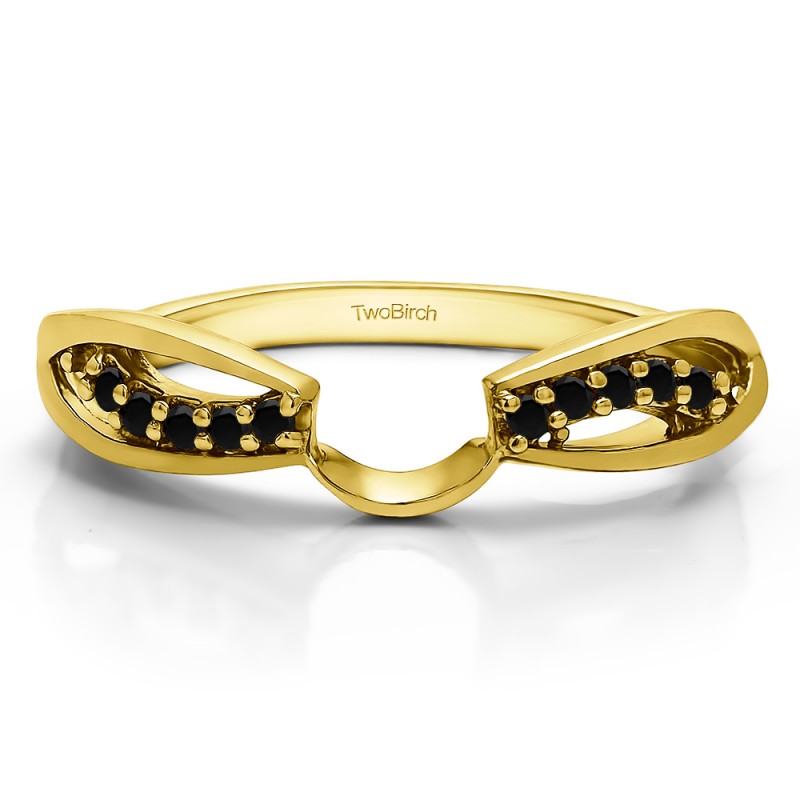This ring wrap has 10 round, prong set stones with a total combined weight of 0.1 carats. It has a total width of 2 millimeters and features a swirl design with a cut out, finished off with a high polish. This ring wrap is made to fit a round solitaire from 0.3 carat up to 1 carat, or a marquise solitaire from 0.25 carat up to 0.5 carat, or a princess solitaire from 0.5 carat up to 1 carat.
