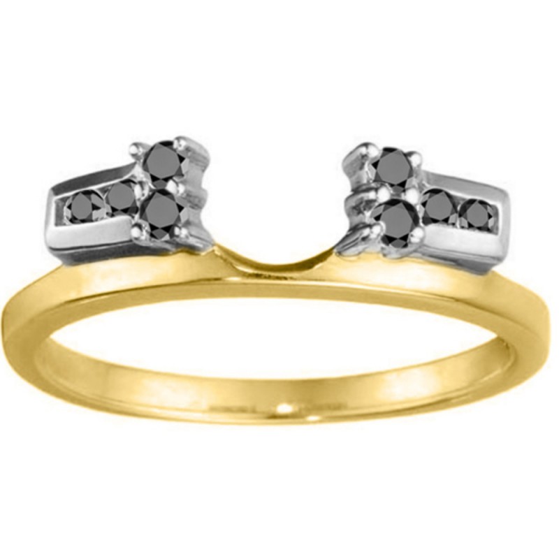 This ring wrap has 8 round, prong set stones with a total combined weight of 0.12 carats. It has a total width of 2 millimeters and has a mix of channel and prong set stones with a traditional high polish finish. This ring wrap is made to fit a round solitaire from 0.25 carat up to 0.5 carat, or a marquise solitaire from 0.25 carat up to 0.5 carat, or a princess solitaire from 0.25 carat up to 0.5 carat.