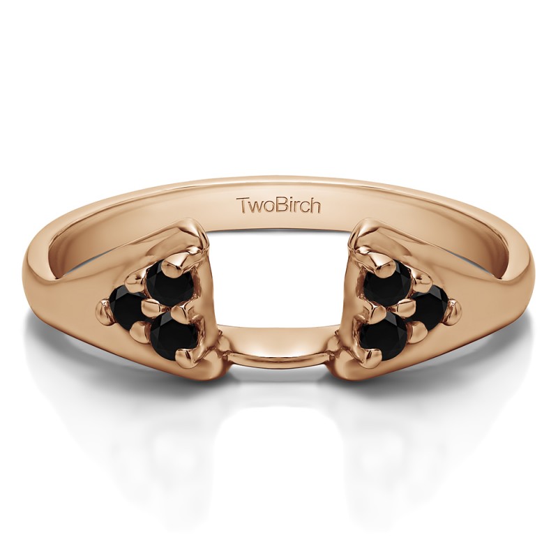 This ring wrap has 6 round, prong set stones with a total combined weight of 0.15 carats. It has a total width of 2 millimeters and has six stones, three on each side of the center, giving it a three stone look. This ring wrap is made to fit a round solitaire from 0.5 carat up to 1 carat, or a marquise solitaire from 0.25 carat up to 0.5 carat, or a princess solitaire from 0.5 carat up to 0.75 carat.
