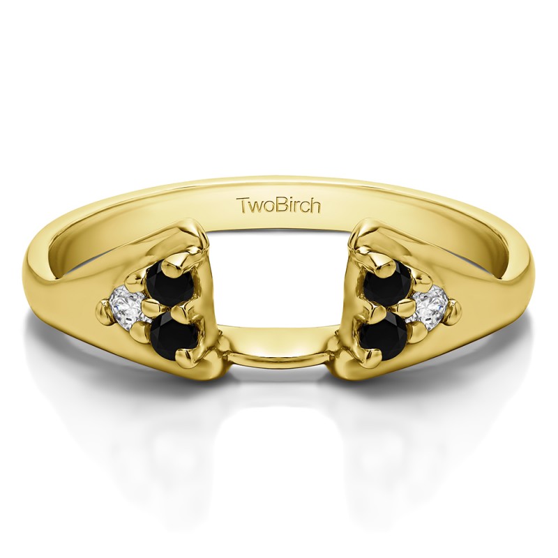 This ring wrap has 6 round, prong set stones with a total combined weight of 0.15 carats. It has a total width of 2 millimeters and has six stones, three on each side of the center, giving it a three stone look. This ring wrap is made to fit a round solitaire from 0.5 carat up to 1 carat, or a marquise solitaire from 0.25 carat up to 0.5 carat, or a princess solitaire from 0.5 carat up to 0.75 carat.