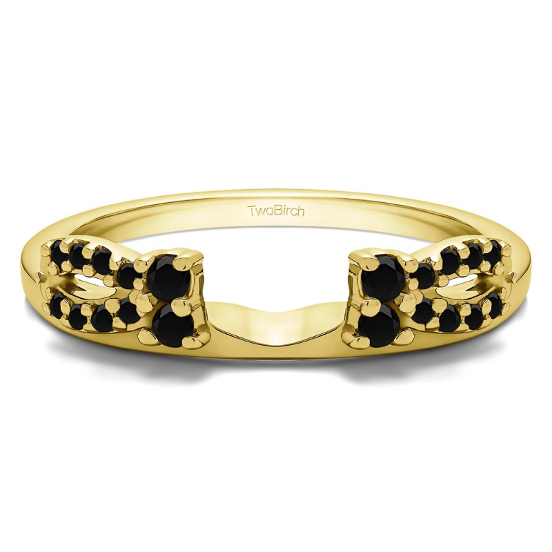 This ring wrap has 20 round, prong set stones with a total combined weight of 0.2 carats. It has a total width of 2 millimeters. The stones in this wrap are set with a cutout in the center giving it a bow shape. This ring wrap is made to fit a round solitaire from 0.25 carat up to 0.5 carat, or a marquise solitaire from 0.25 carat up to 0.5 carat, or a princess solitaire from 0.25 carat up to 0.5 carat.