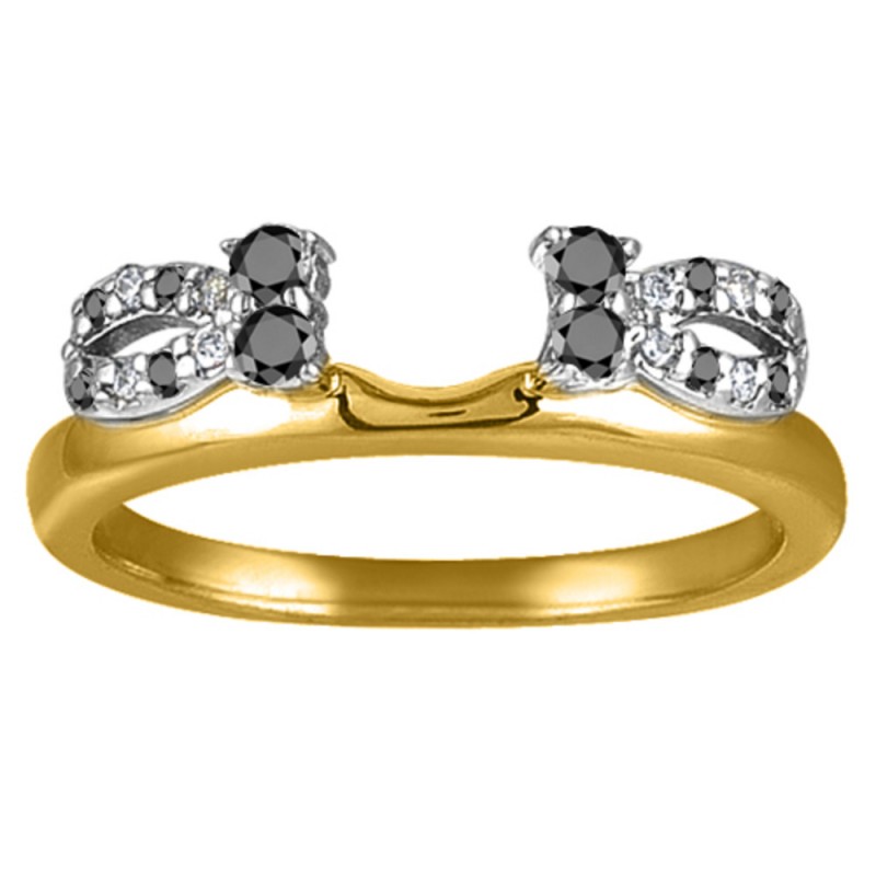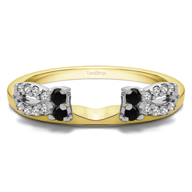 This ring wrap has 20 round, prong set stones with a total combined weight of 0.2 carats. It has a total width of 2 millimeters. The stones in this wrap are set with a cutout in the center giving it a bow shape. This ring wrap is made to fit a round solitaire from 0.25 carat up to 0.5 carat, or a marquise solitaire from 0.25 carat up to 0.5 carat, or a princess solitaire from 0.25 carat up to 0.5 carat.