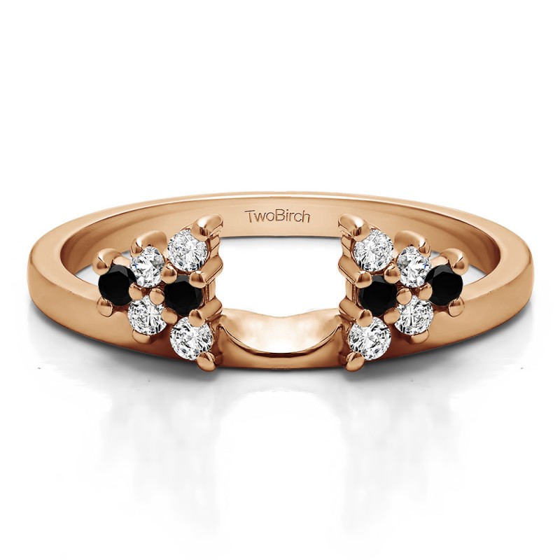 This ring wrap has 12 round, prong set stones with a total combined weight of 0.23 carats. It has a total width of 2 millimeters. The clusters in this ring wrap are shaped like a triangle. This ring wrap is made to fit a round solitaire from 0.25 carat up to 1 carat, or a marquise solitaire from 0.25 carat up to 0.5 carat, or a princess solitaire from 0.3 carat up to 1 carat.